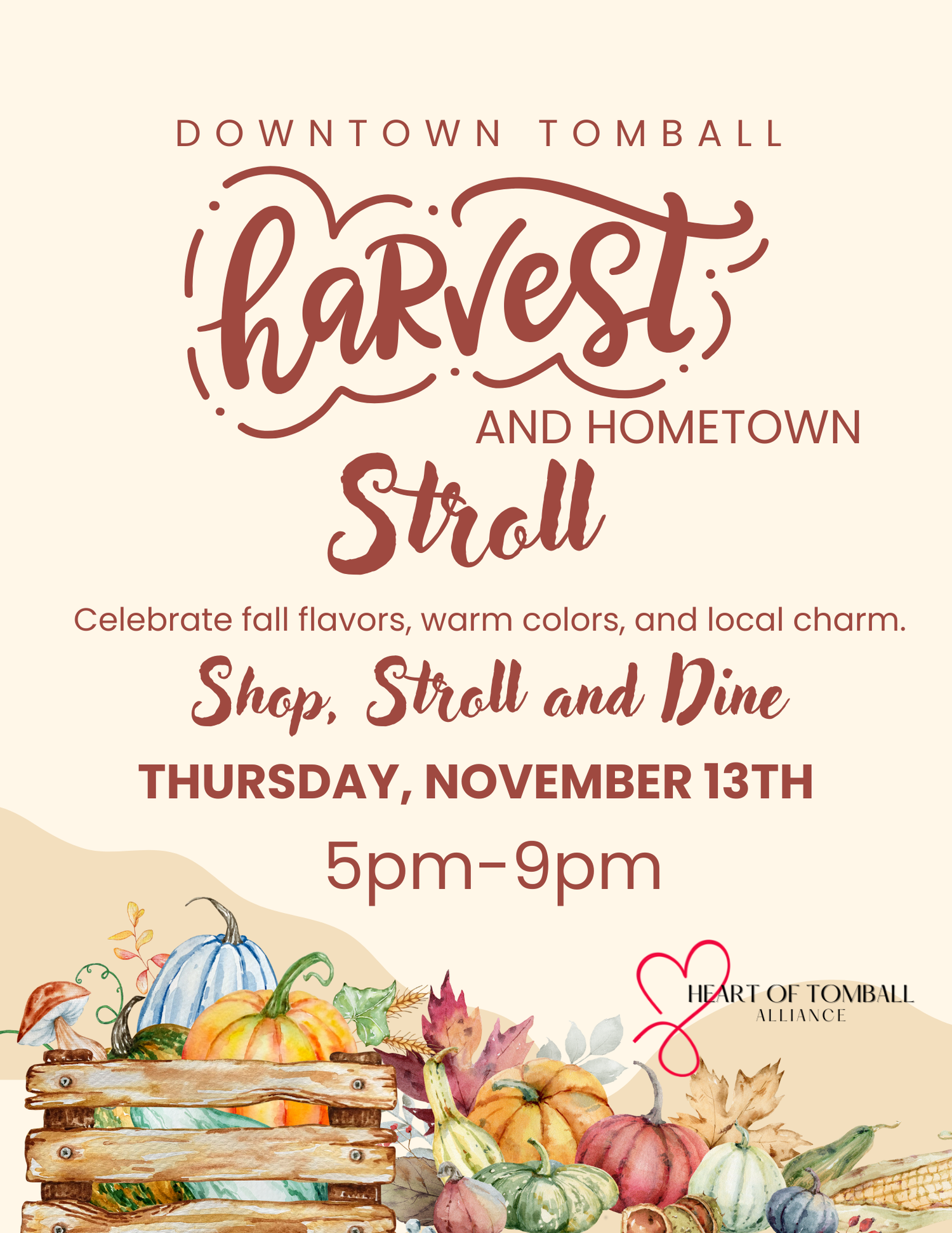 Join us for a fun event Downtown Tomball! Shop, stroll and dine your way around town! Enjoy all the fall finds this holiday season!