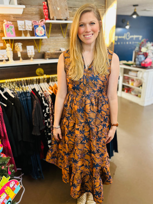 Ruffled Neck Midi Dress Rust/Blue/Black