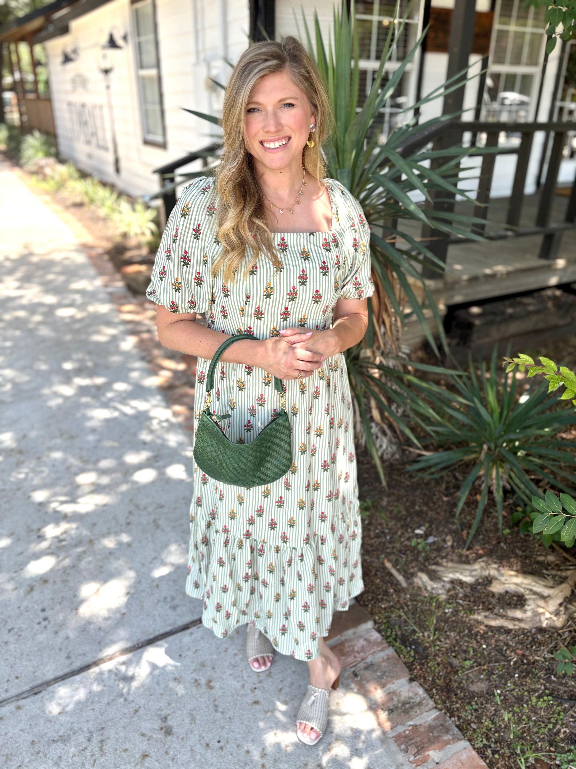 Green and white stripes with floral block print. Maxi length dress with bubble sleeves.