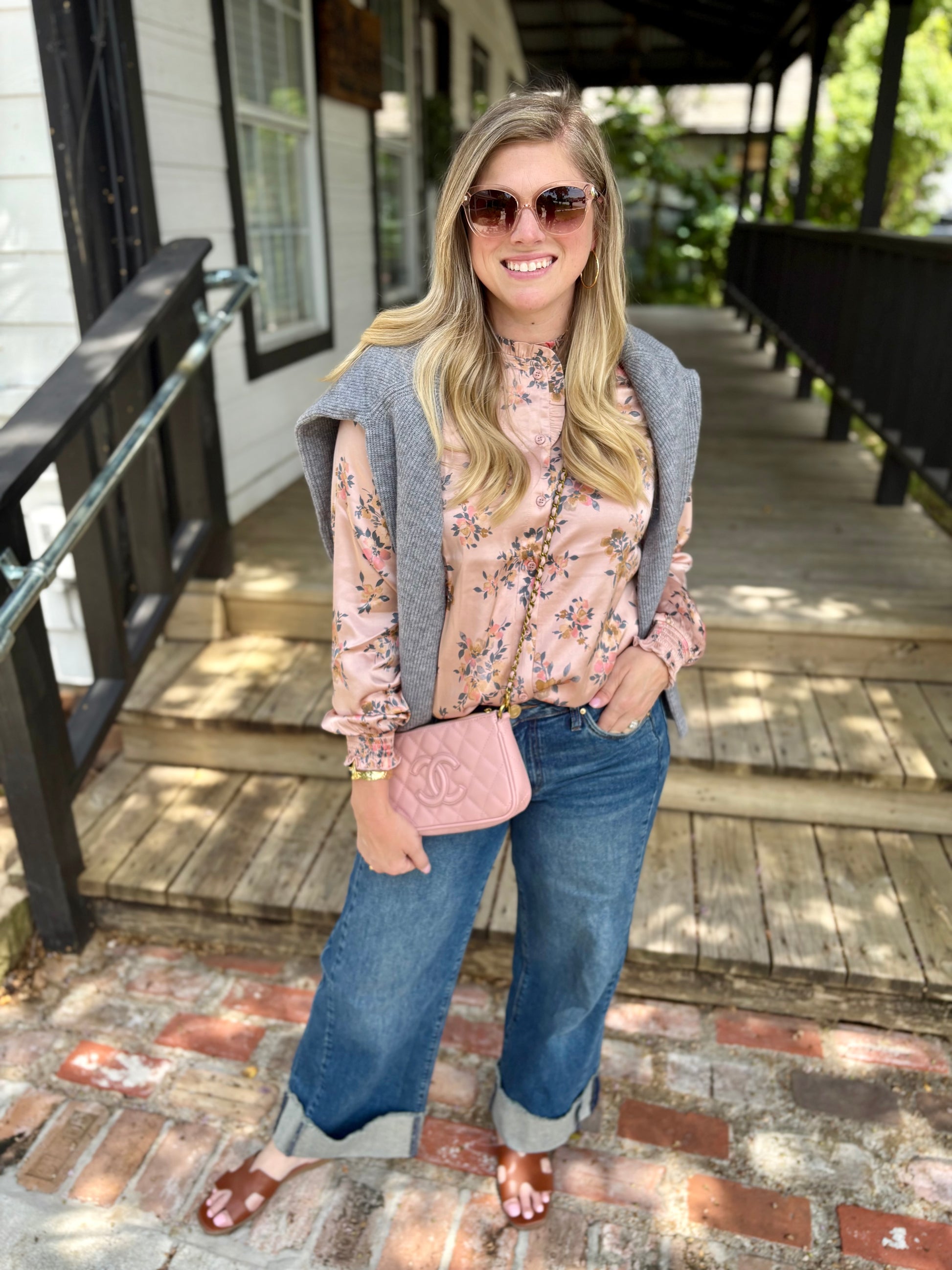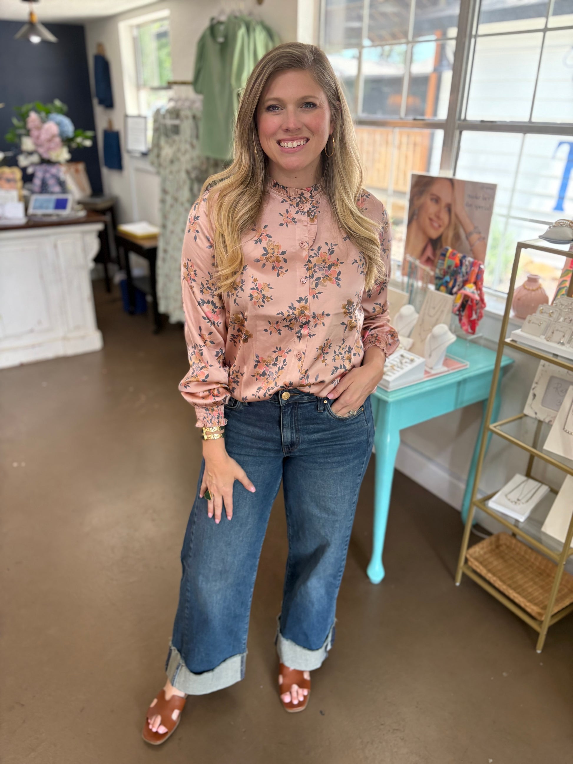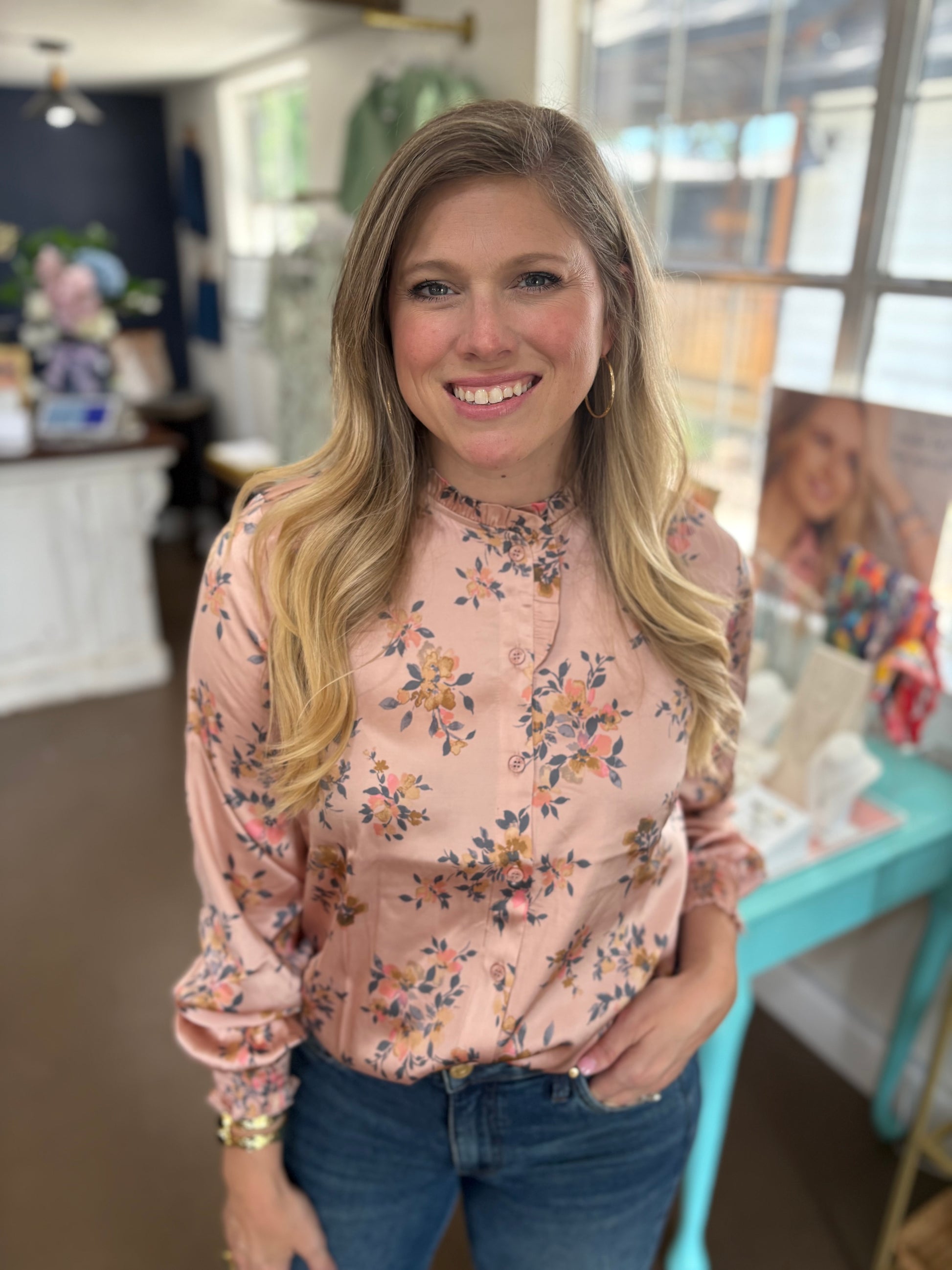 Powder pink button down blouse with floral print and detail at collar and sleeves.