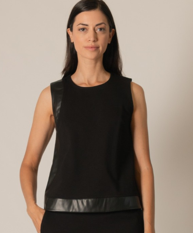 Faux leather contrast sleeveless top in black. This is an ideal top to have on hand for holiday parties.
