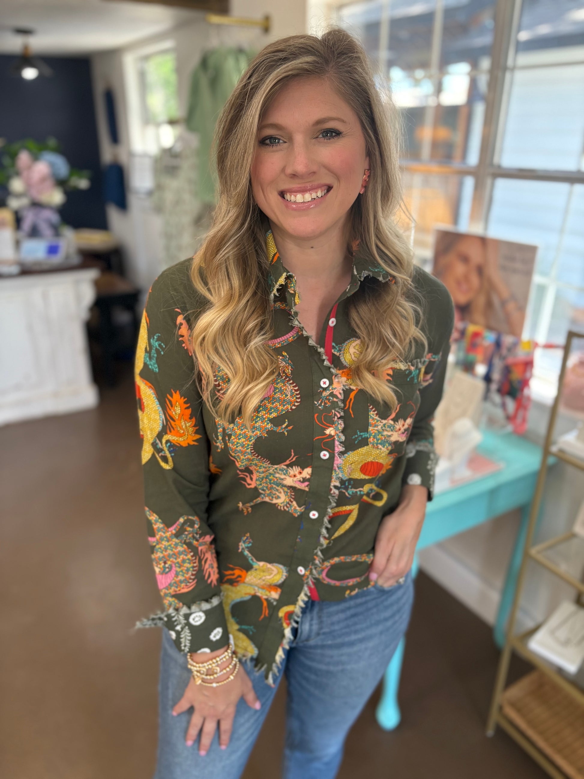 A statement piece with a touch of the unexpected. Deep olive button down features vibrant dragons, frayed edge detailing and contrasting buttons.
