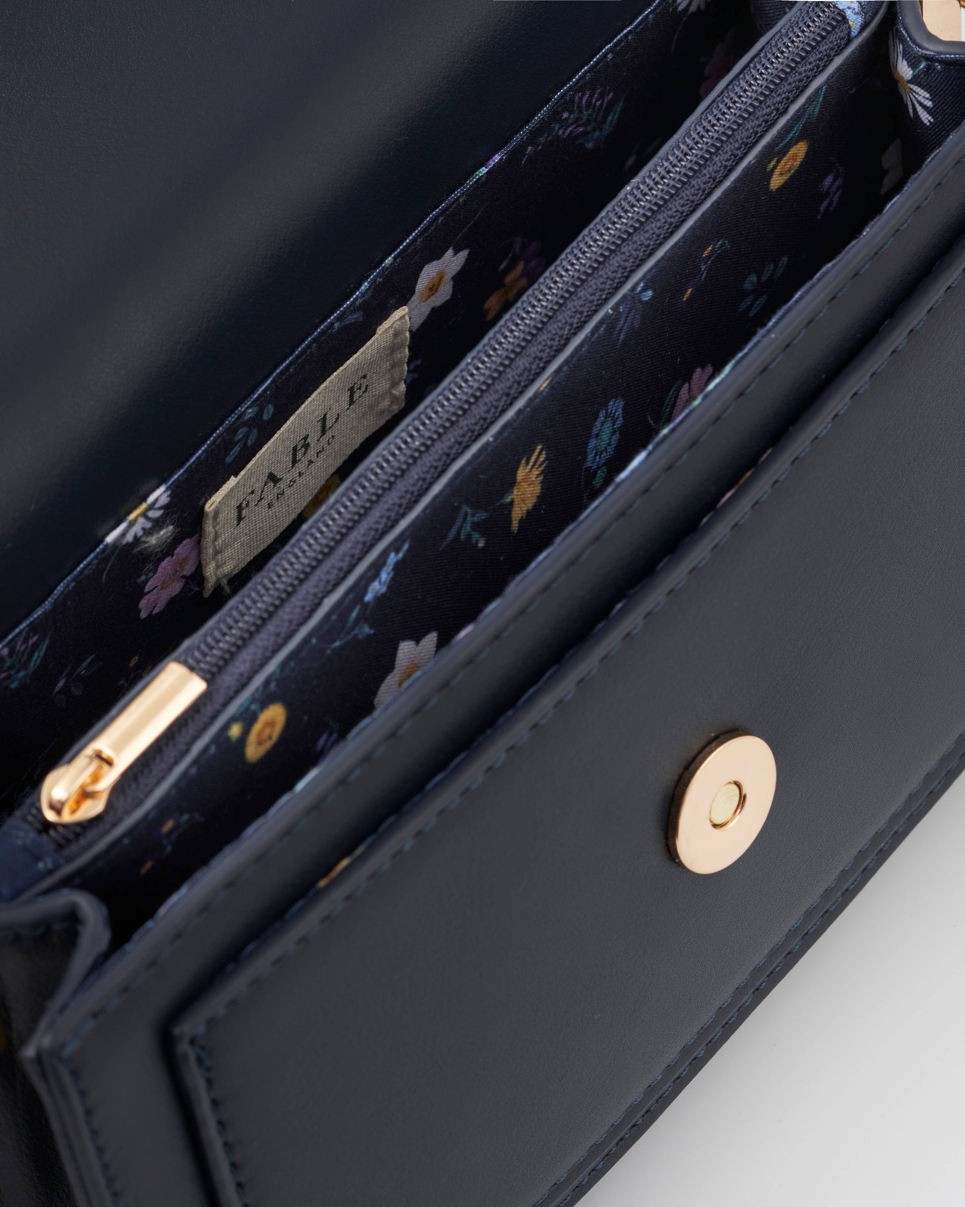Introducing our Running Bunny Navy Shoulder Purse, a masterpiece that marries timeless design with a whimsical Fable twist. Crafted from high-quality vegan leather, this bag not only champions style but also embodies sustainability. The interior is adorned with a delightful floral pattern that adds a touch of charm and surprises in every use. Emblazoned with our signature Fable bee plaque, this shoulder purse is not just an accessory; it’s a statement piece that seamlessly complements our collection of scarves and accessories, all featuring the playful Running Bunny print in a variety of vibrant colors. With its timeless silhouette and understated elegance, the Ditsy Shoulder Purse is highly versatile and will effortlessly enhance any display, making it an indispensable addition to your store.