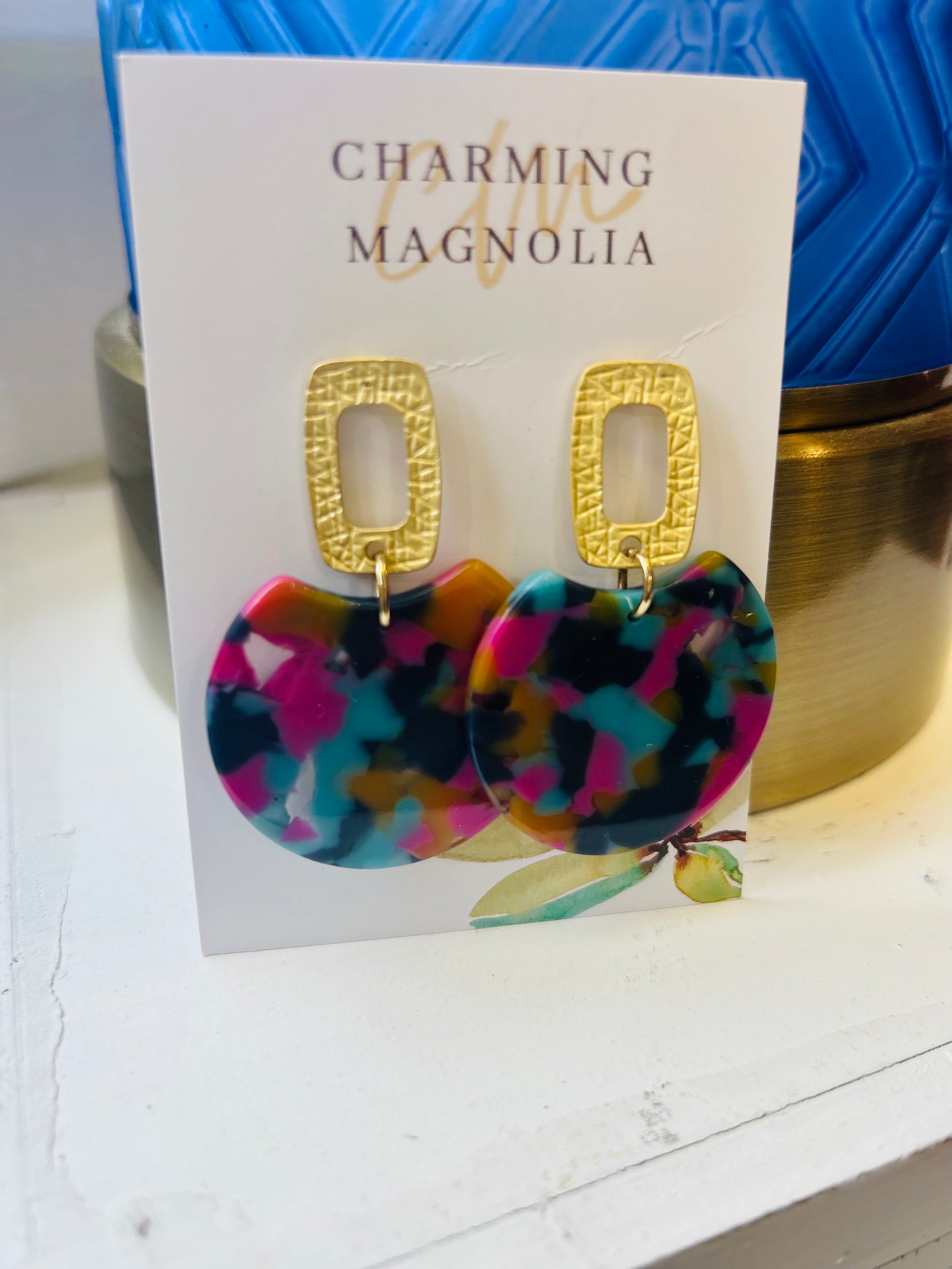 pink, navy, orange mosaic acrylic dangle with gold stud