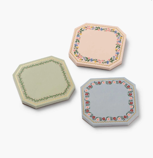 Jot down reminders or leave a sweet note with this set of three floral-bordered notepads, with metallic gold details and 50 tear-off sheets each.