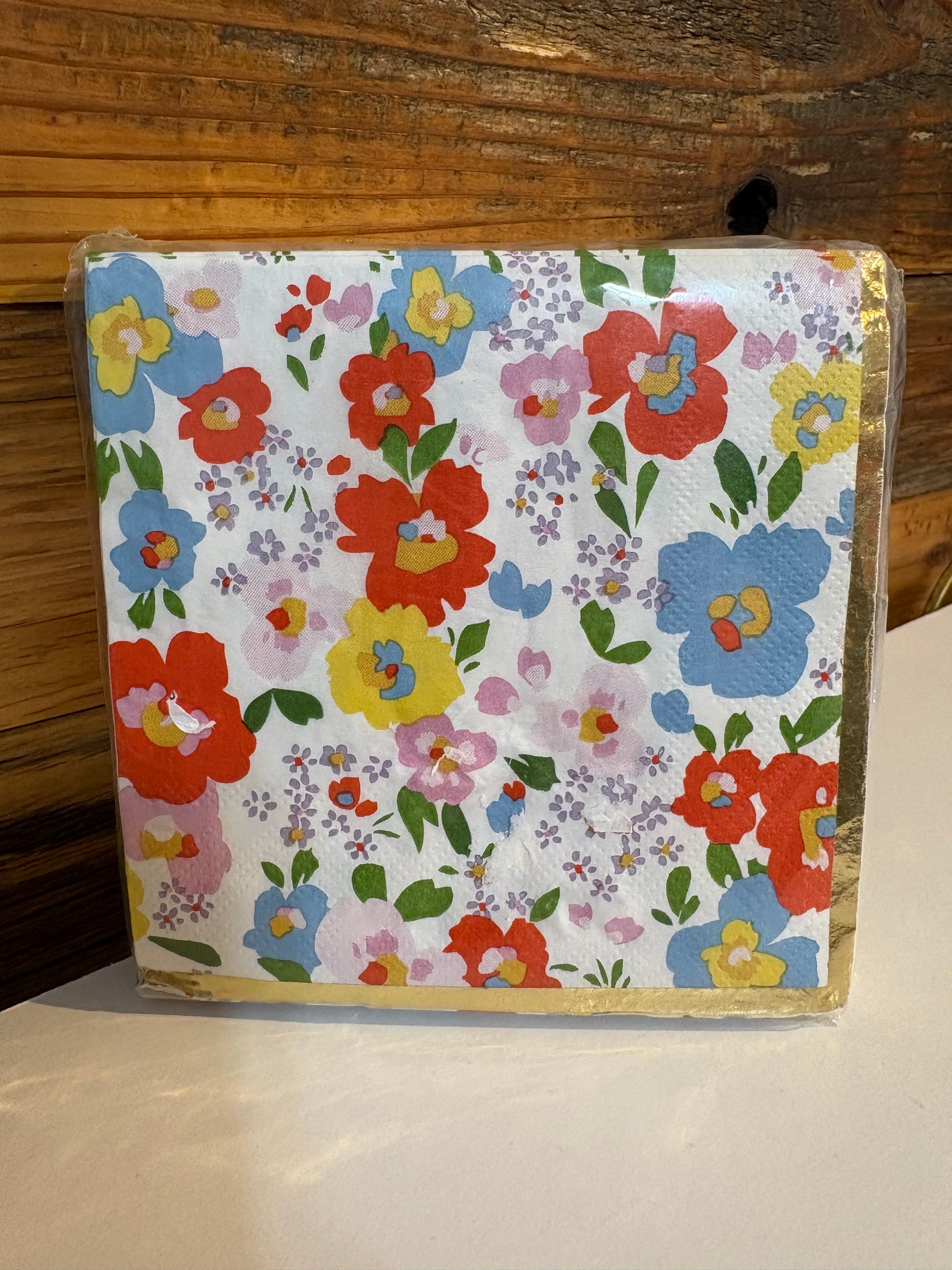 Beverage napkins featuring a bright, floral pattern and a gold edge.