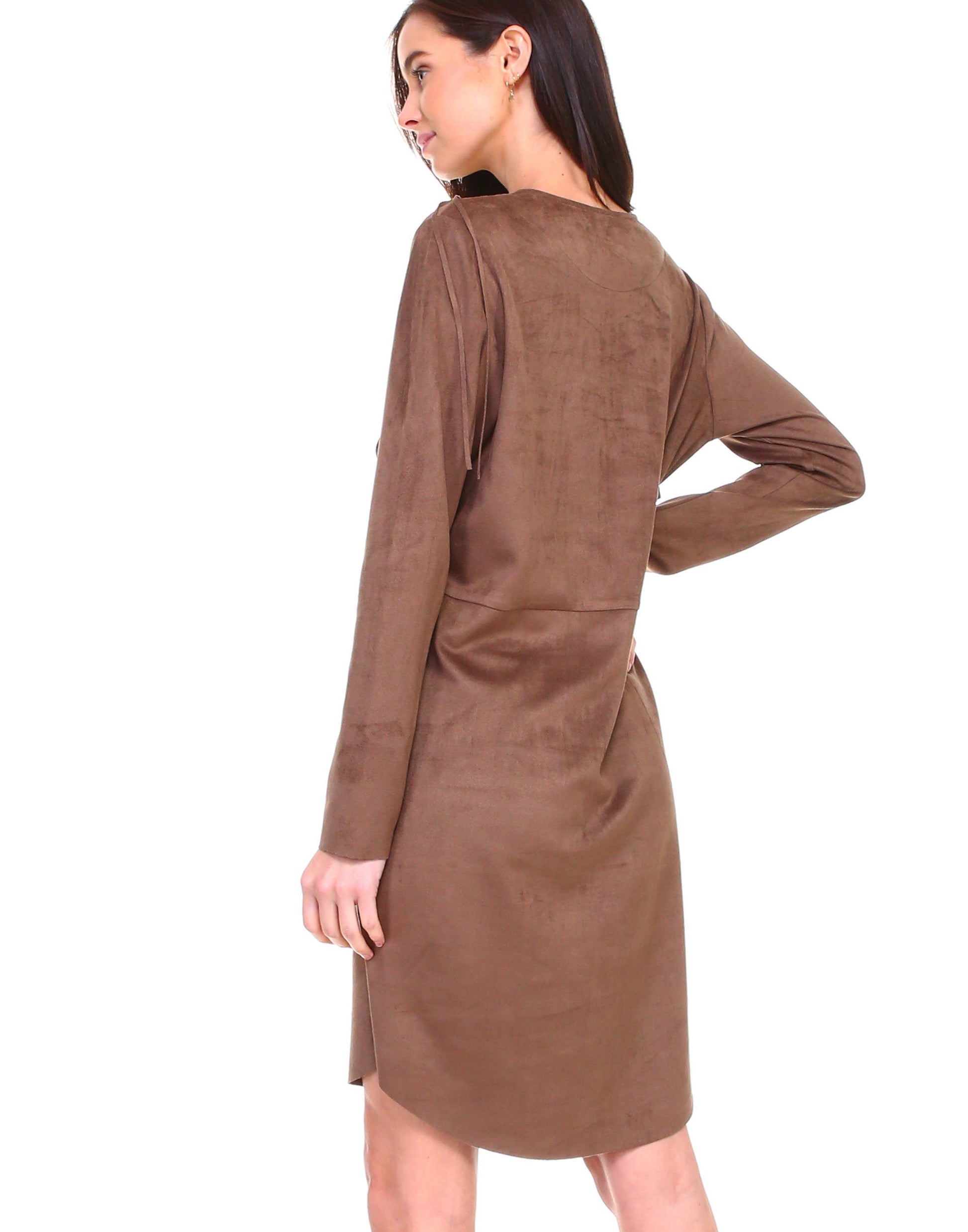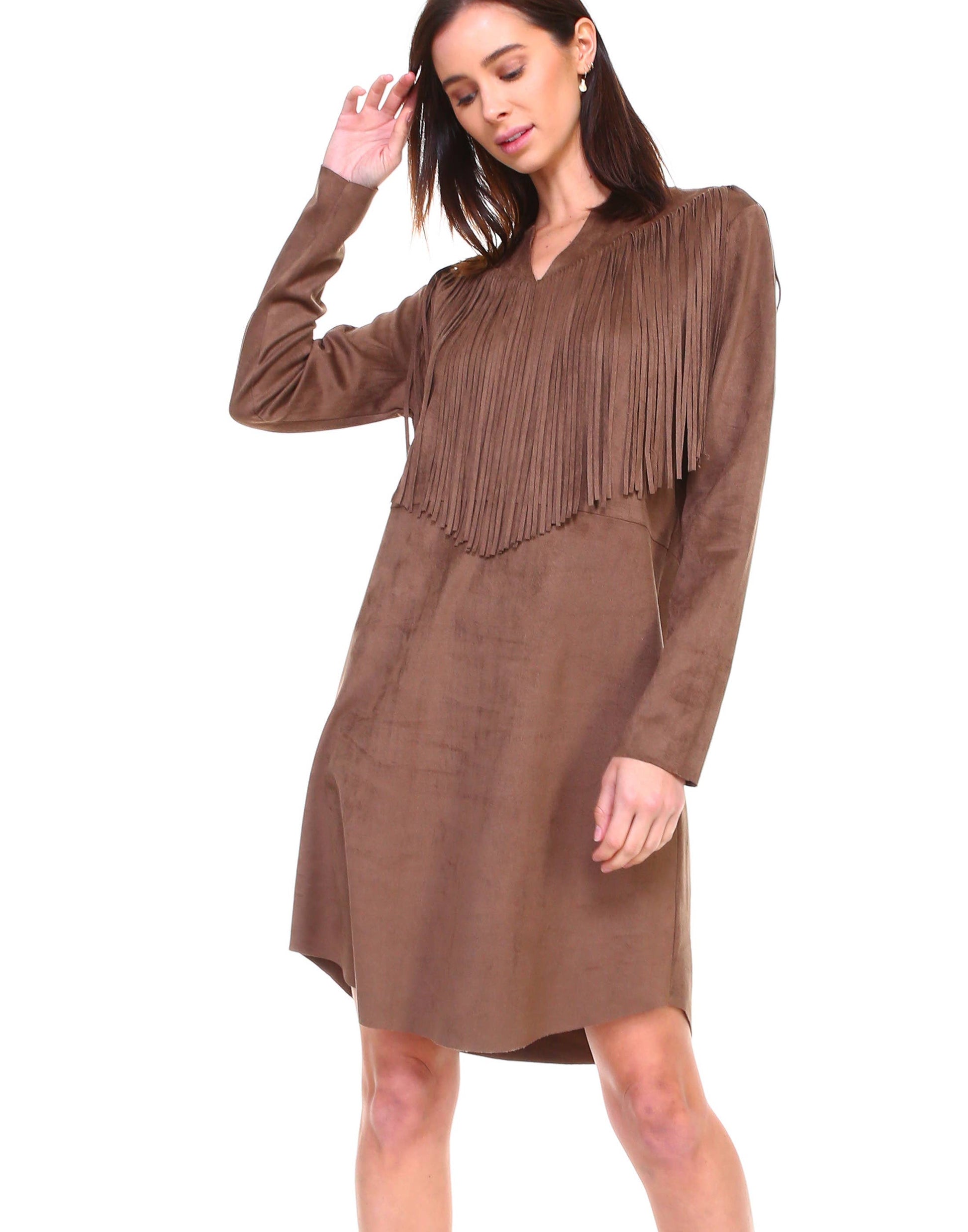 The Angie dress beautifully made with stretch faux suede and detailed with hand-cut fringe. Can be worn as a tunic or dress. Front v-neck. Long sleeve. Clean bottom hems. Super soft and comfy. Drapes beautifully.