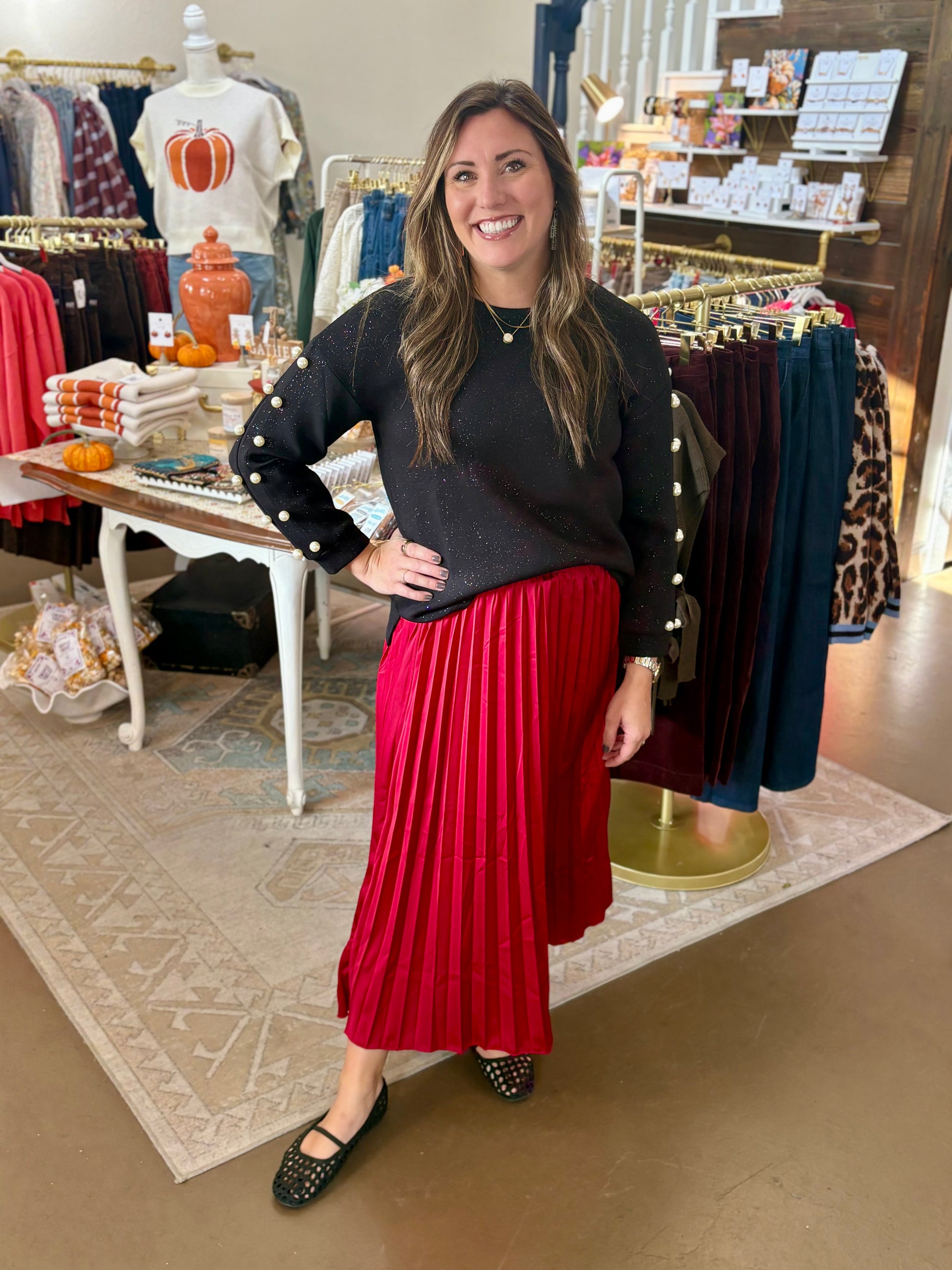 Beautifully made with high quality French scuba knit fabric. Drapes beautifully. Pearls along the arm sleeves. Long sleeves. Crew Neck. Clean hems. Generous easy relax fit. Super soft and comfy. Very chic and stylish. Truly one of a kind. Timeless. Style this Top with the matching: Farrah pearl pant with glitter