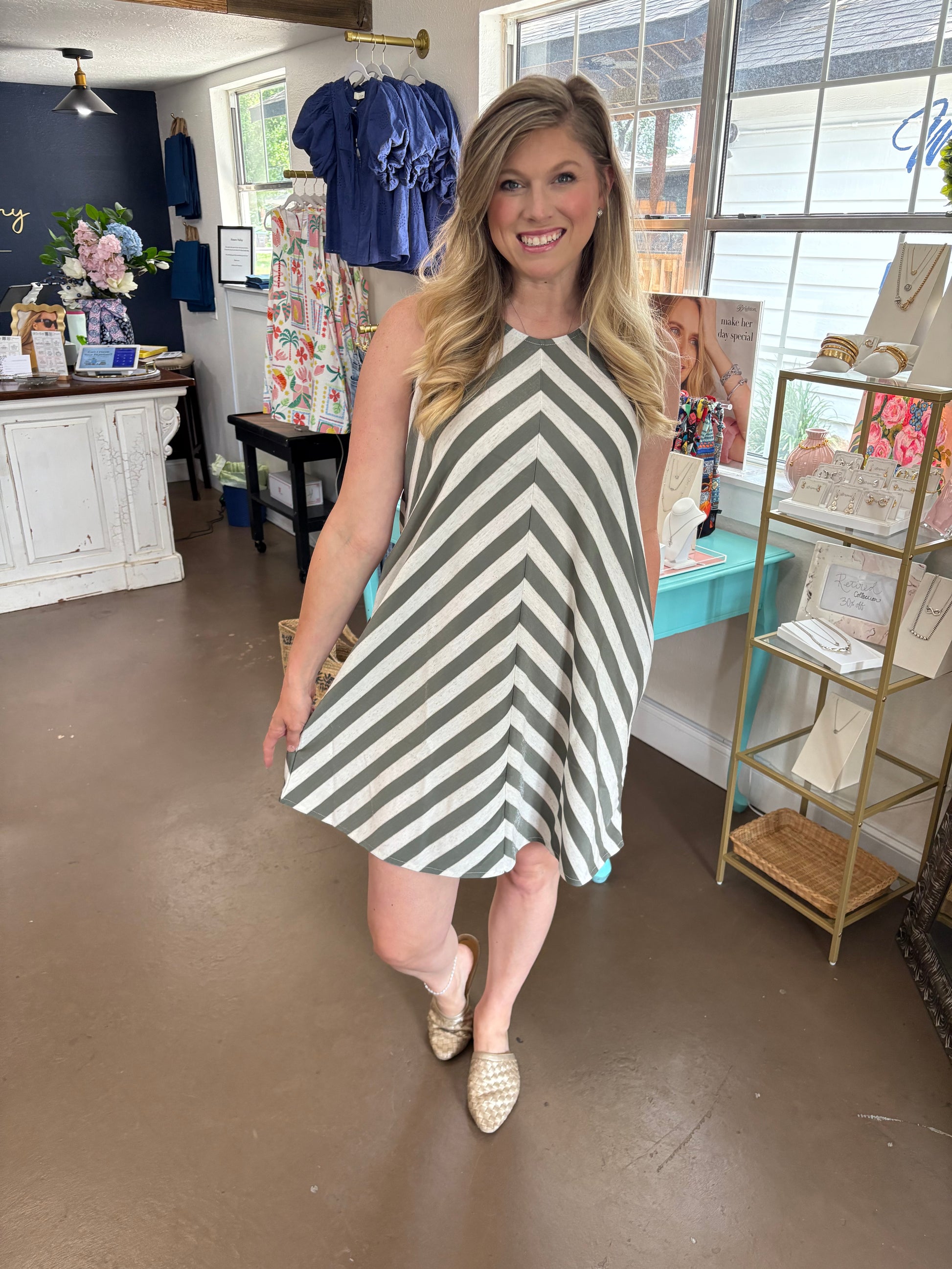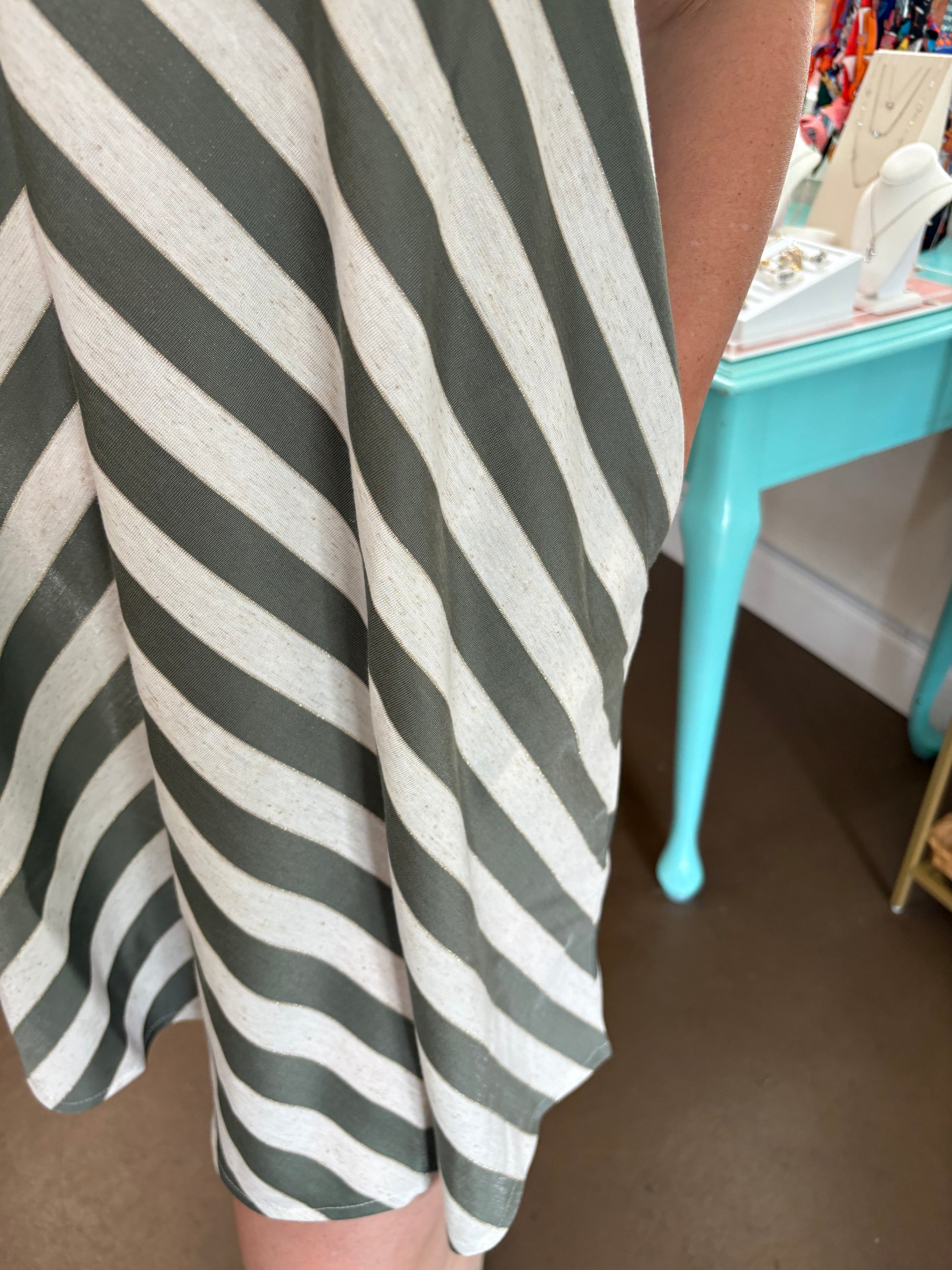 Sleeveless dress that features green, white, and metallic gold colors. Your go-to dress for dressing up or dressing casual.