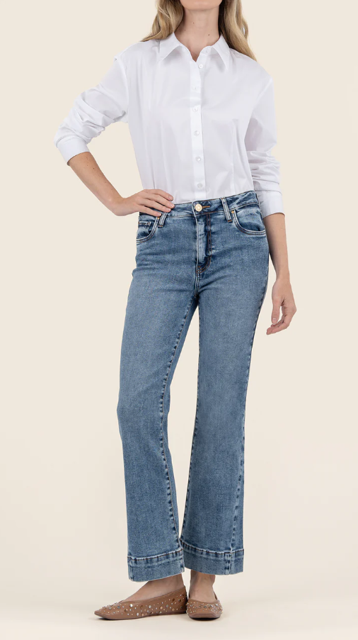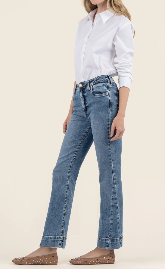 kelsey mid rise jeans with a kick flare and a thick hem at ankle