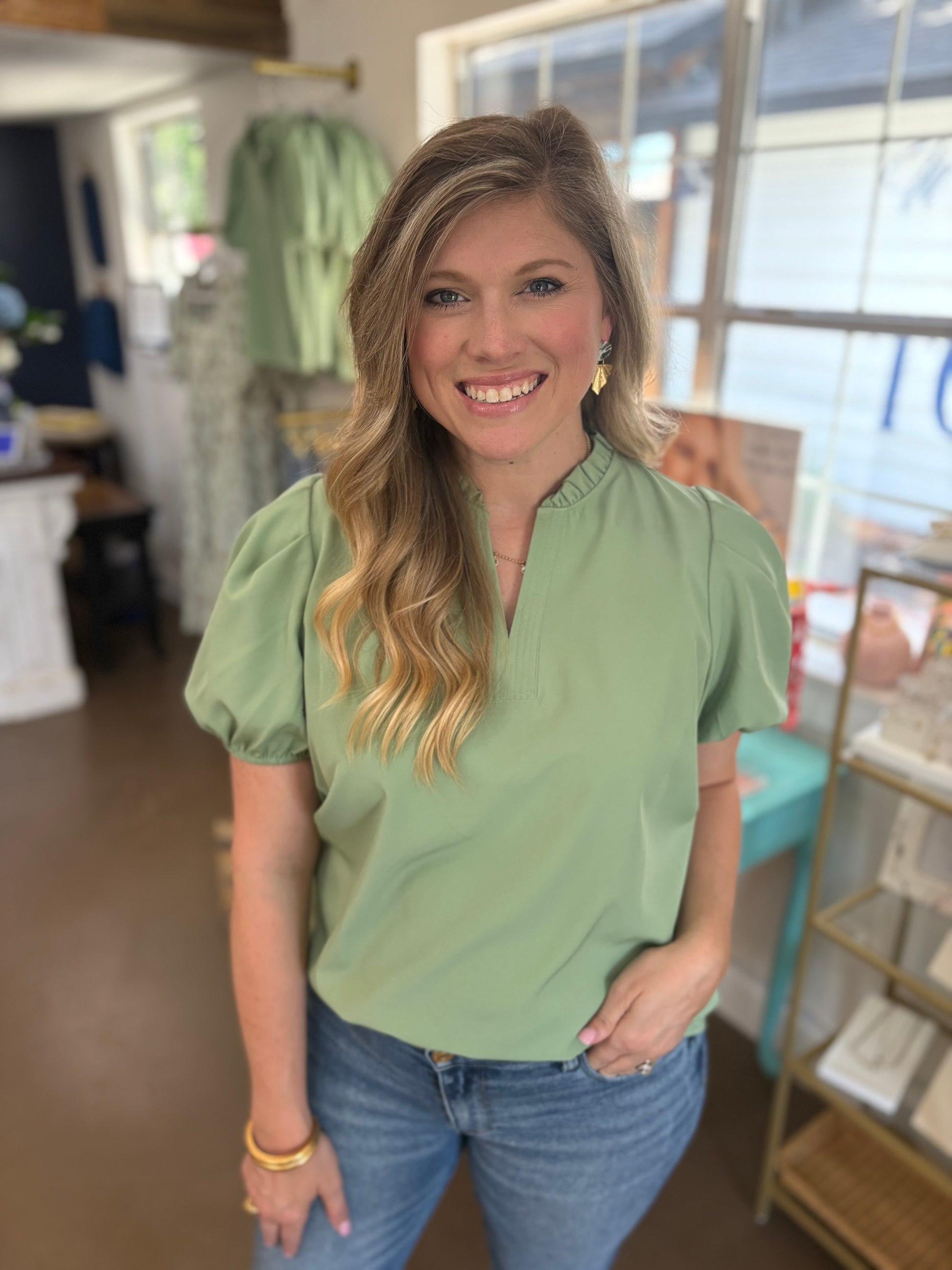 Light green short-sleeve top with ruffled v-neckline and elastic short sleeves.