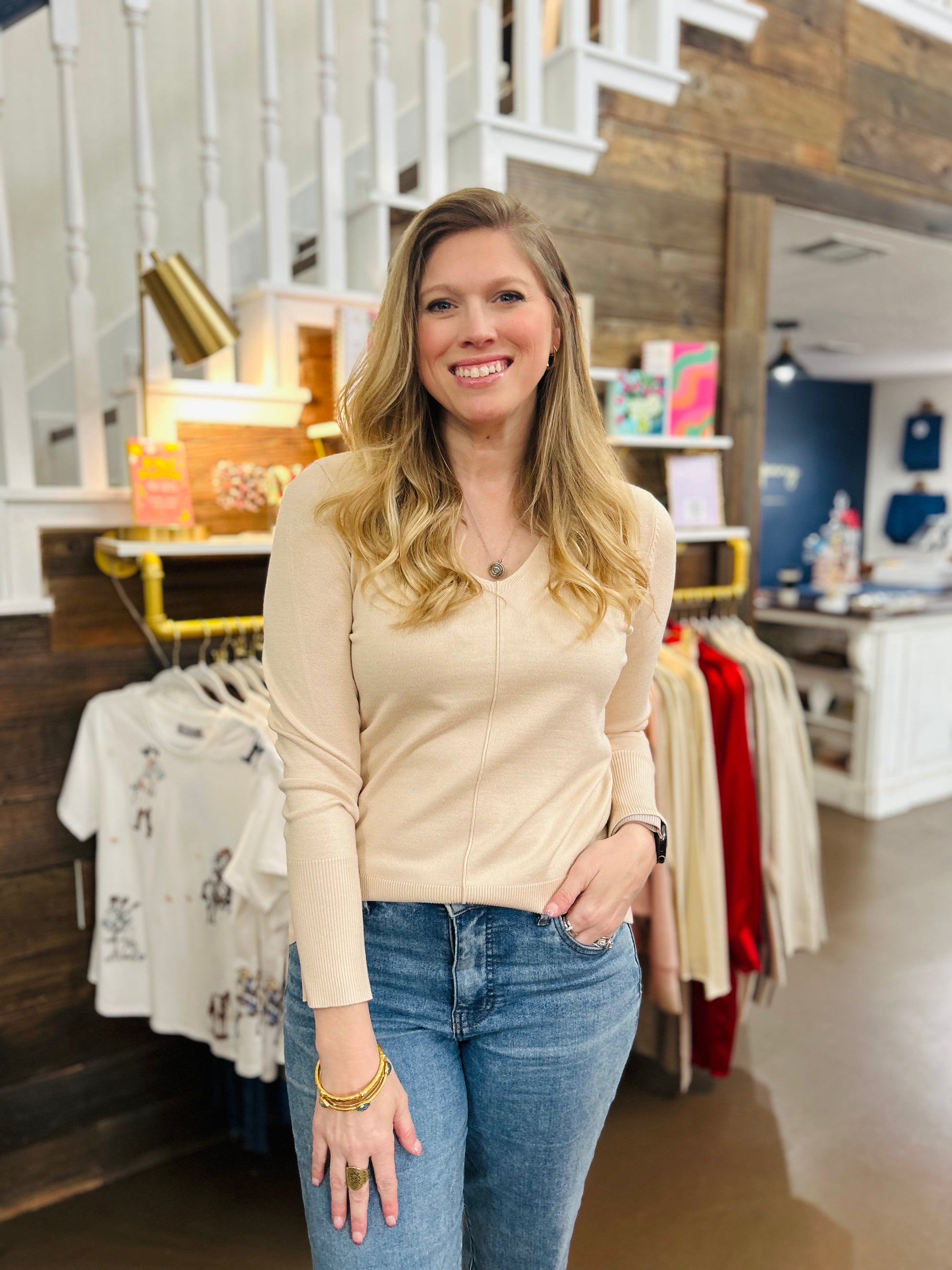 Metric Knit best seller in a new V-Neck style sweater. V-neck long sleeve pullover with front and back seam detail.