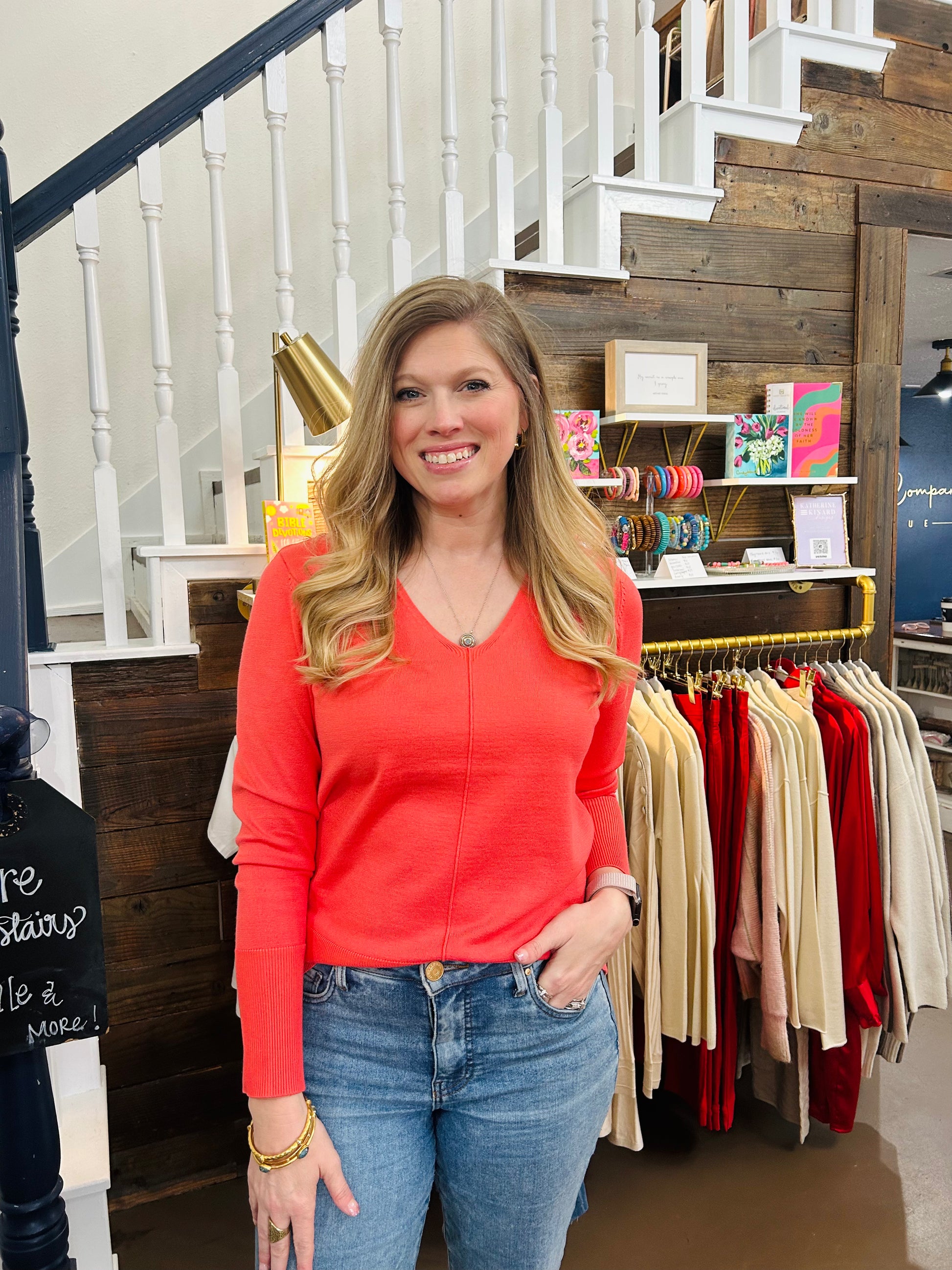 Metric Knit best seller in a new V-Neck style sweater. V-neck long sleeve pullover with front and back seam detail.