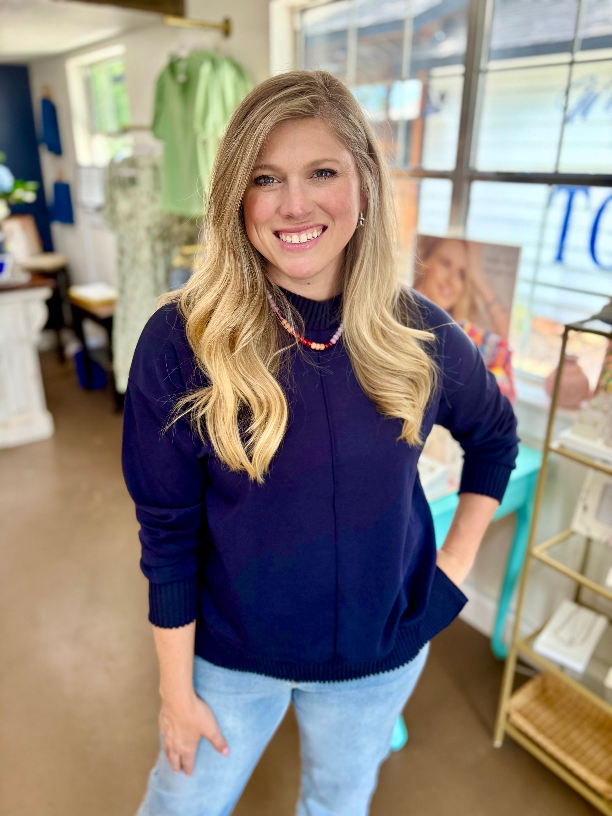 Dark navy long sleeve crew neck top in buttery soft fabric.