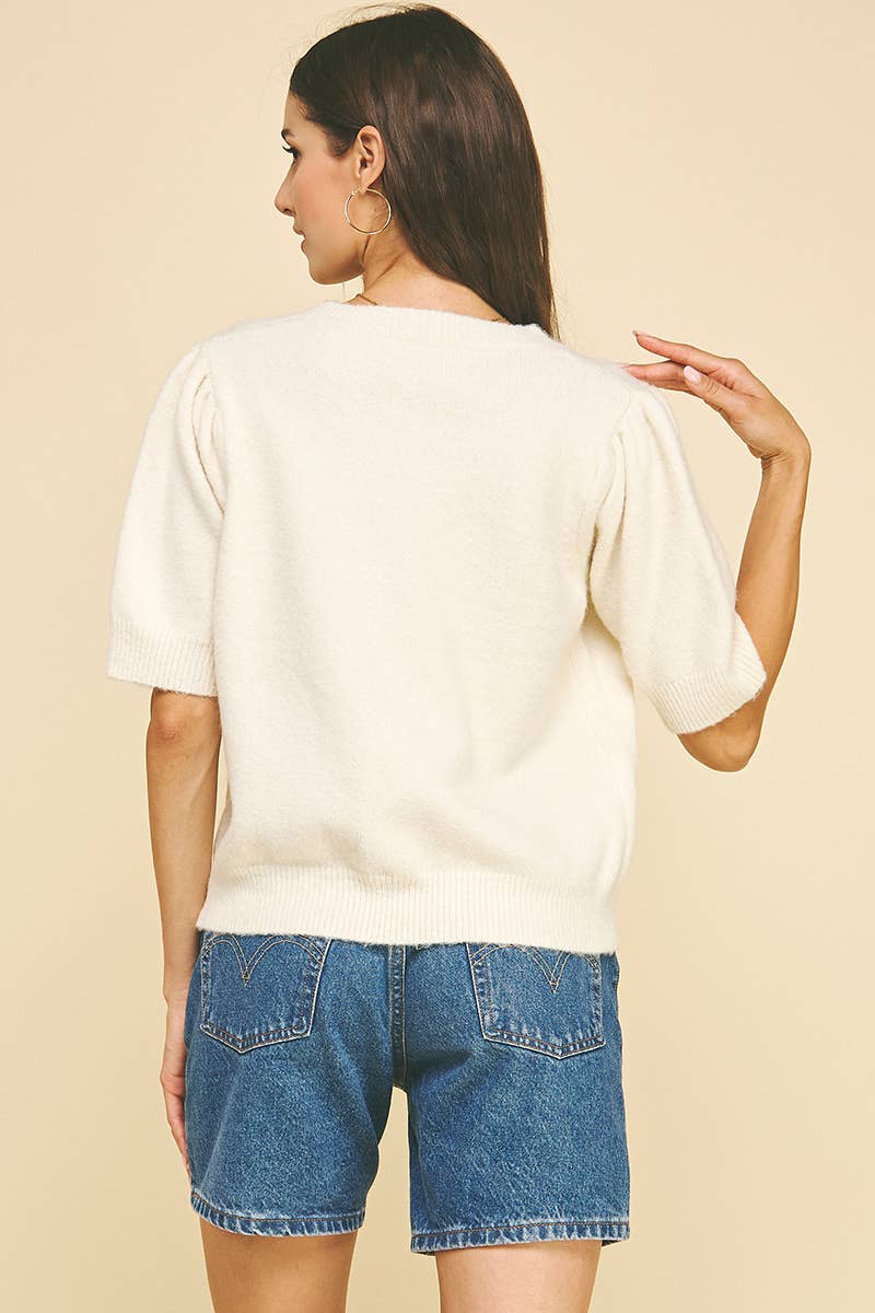SOFT YARN ROUND NECK SHORT SLEEVE HEART SWEATER MODEL WEARS A SIZE SMALL