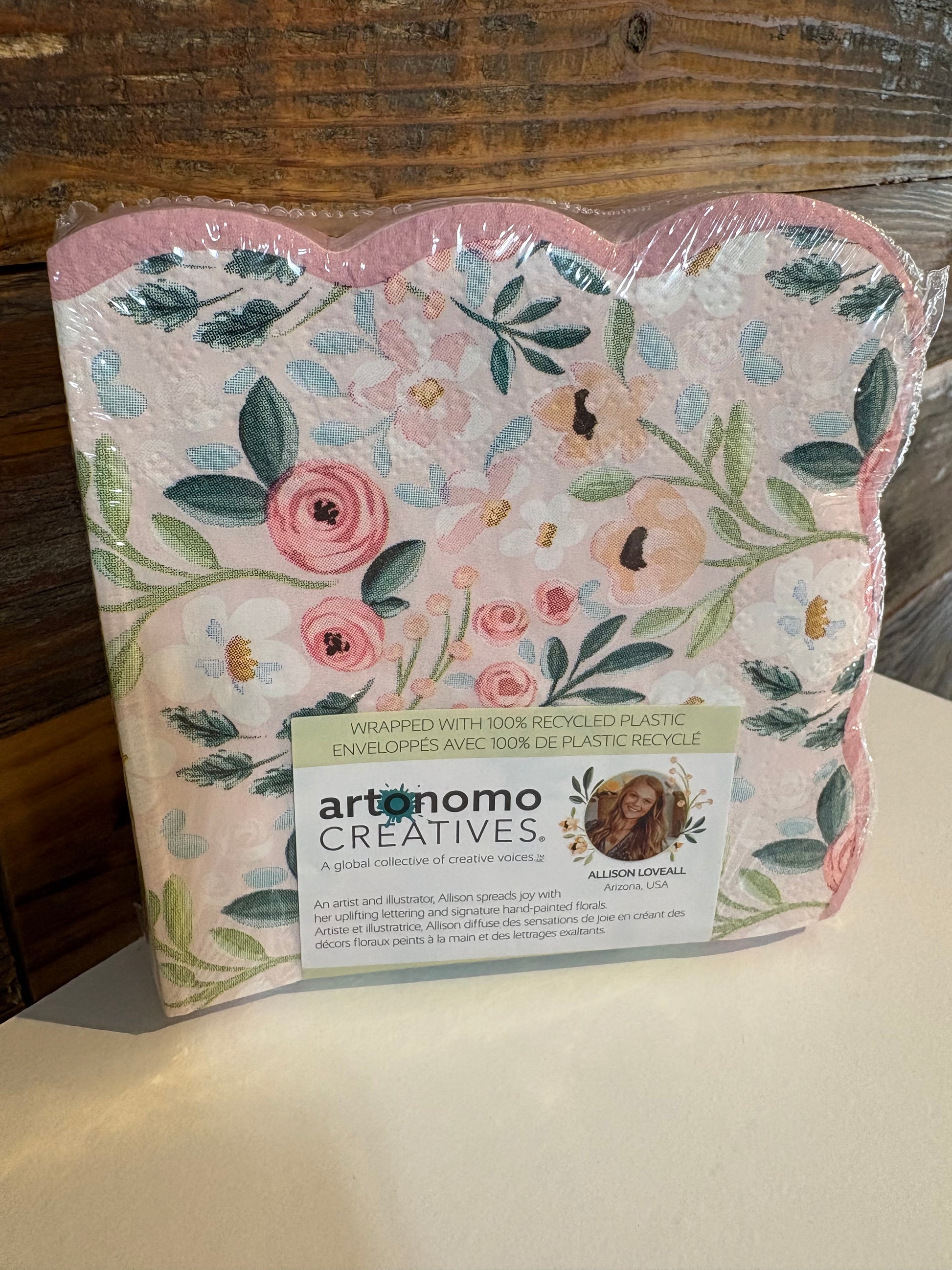 Pink scallop edge with pastel floral design.