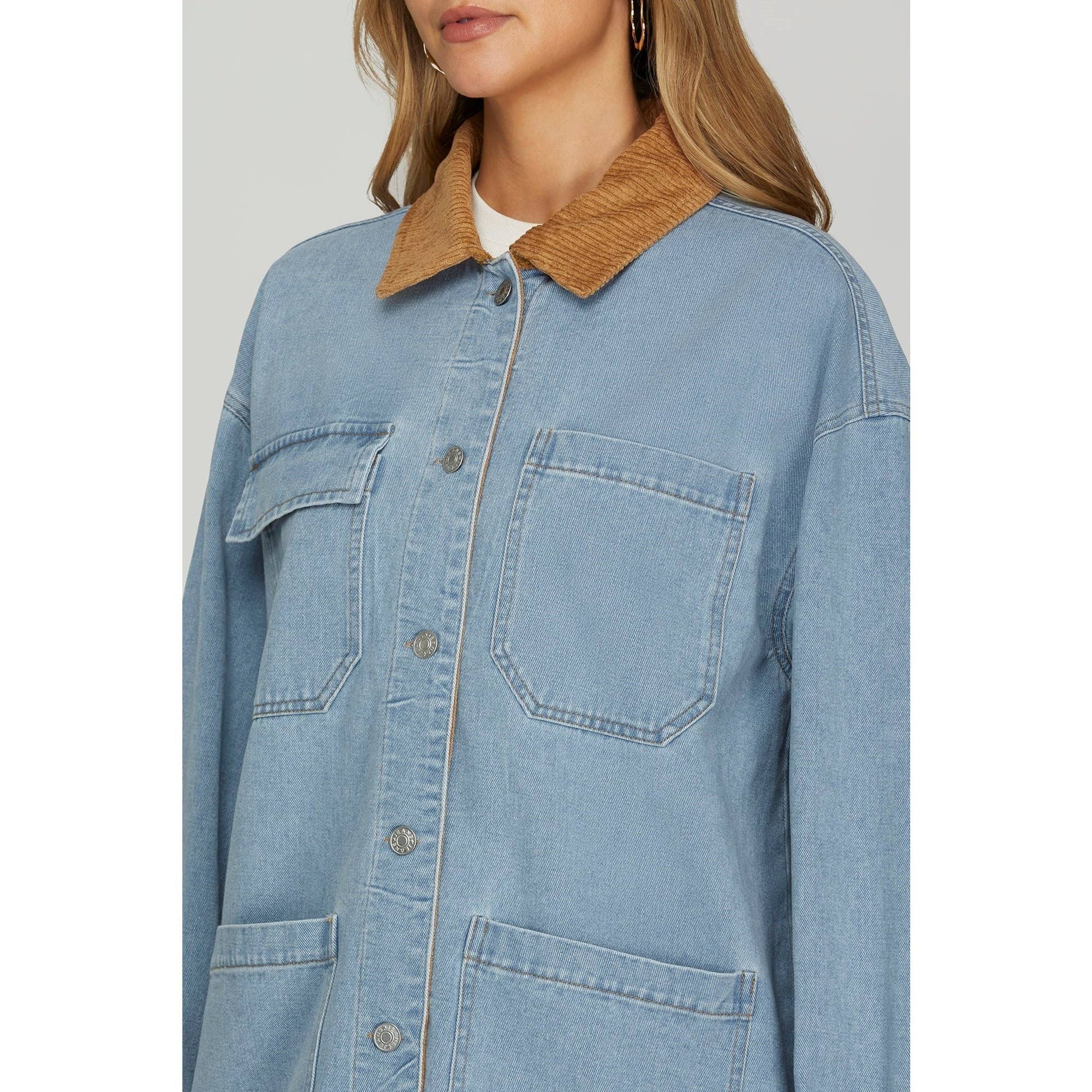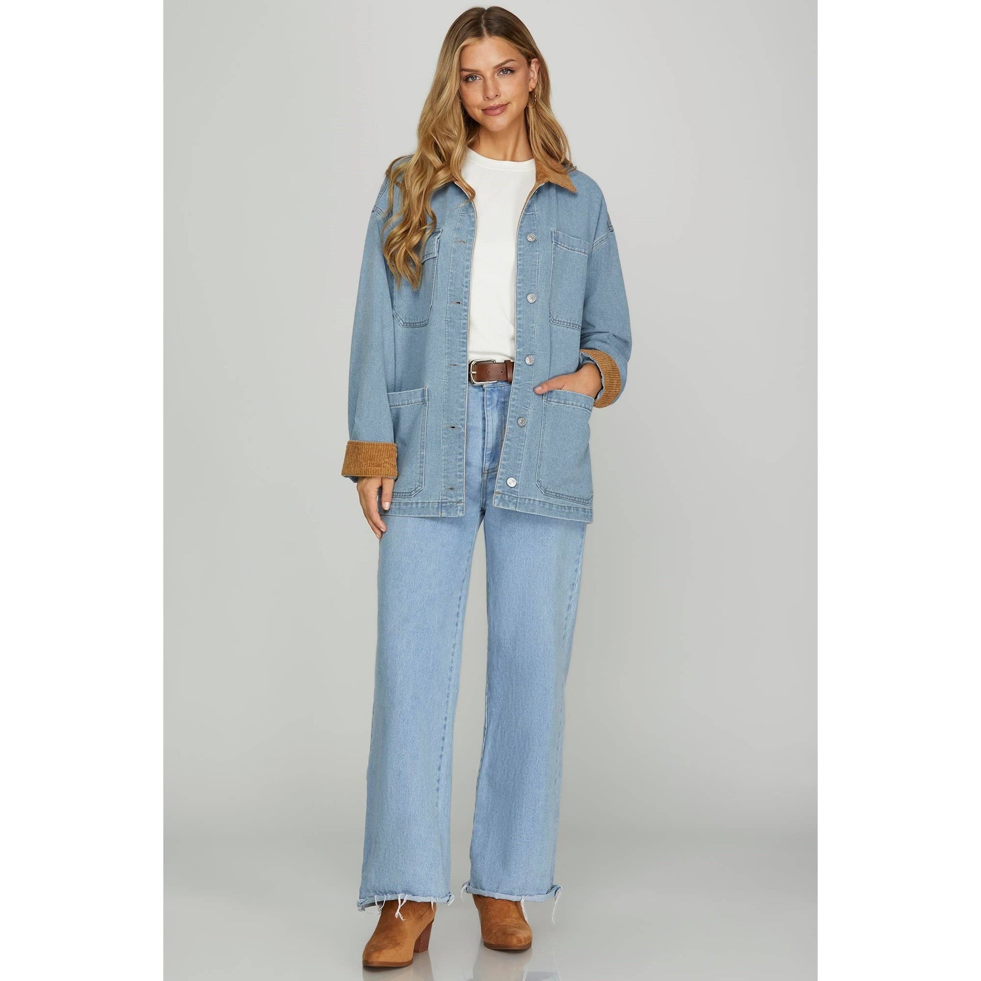 - WASHED DENIM WORKED BARN JACKET WITH CONTRAST COLLAR AND CUFF AND FRONT POCKETS