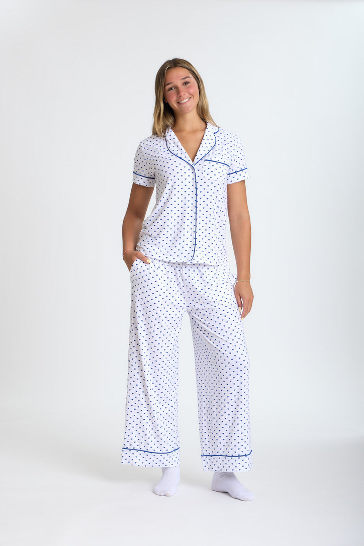 The Sweet Dreams set features a charming small heart pattern that blends comfort and style. The short-sleeve button-down top adds a fresh, timeless touch, while the relaxed-fit pants bring ease and elegance, finished with a hint of feminine charm.