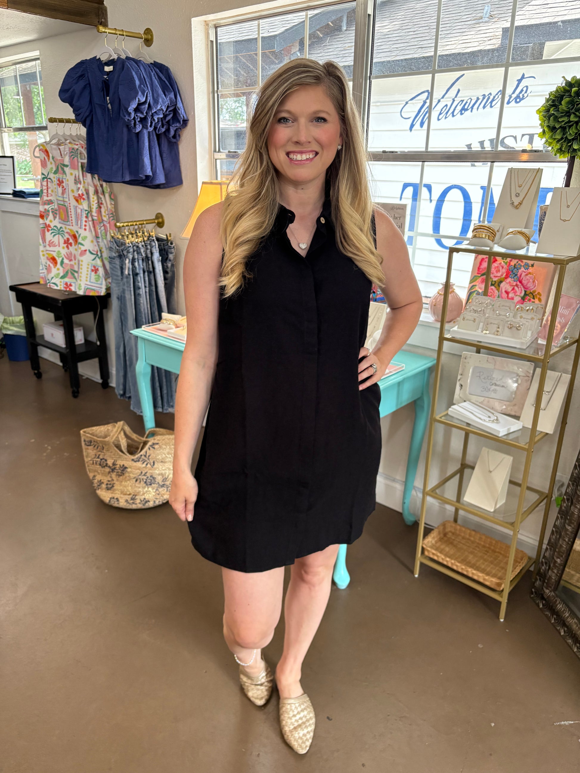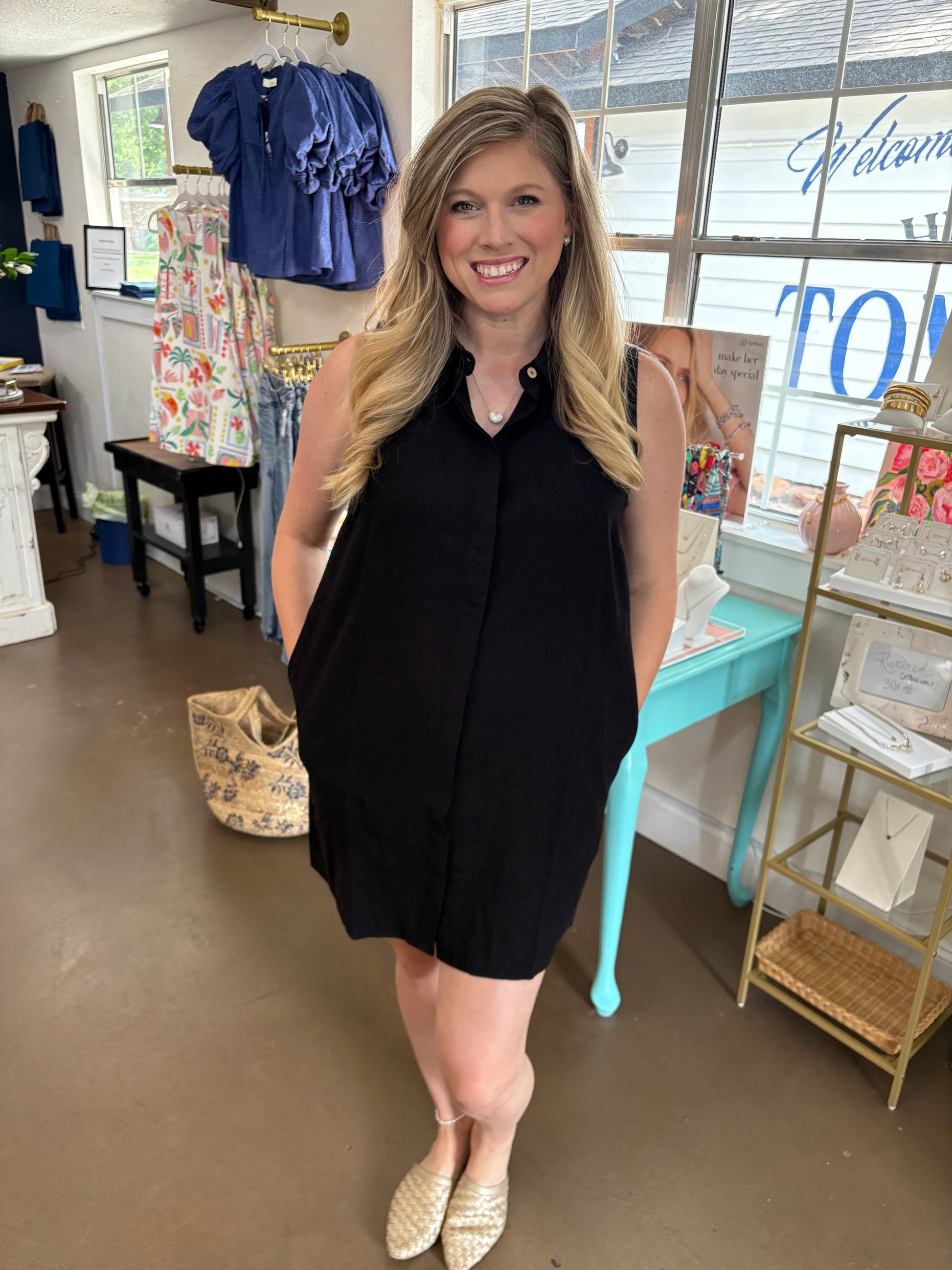 Black sleeveless shirt dress with full button front and collar. Easy and classy for any summer occasion.