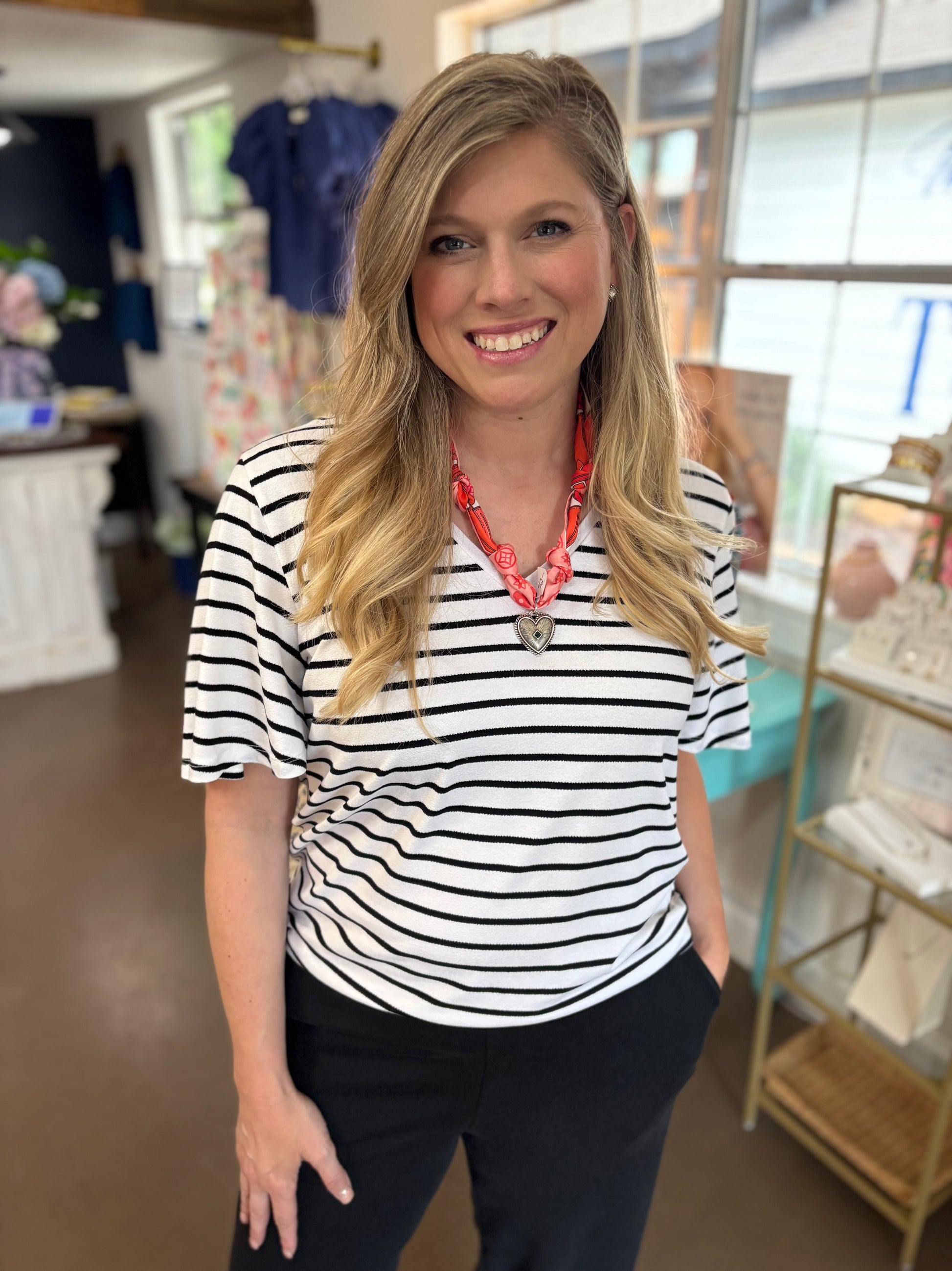 Short-sleeve, black and white stripes, v-neck, flutter sleeves